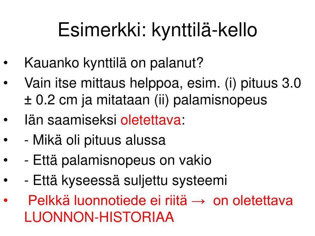 Esimerkki: kynttilä-kello • Kauanko kynttilä on palanut? • Vain itse mittaus helppoa, esim. (i) pituus 3.0 ± 0.2 cm ja mitataan (ii) palamisnopeus • Iän saamiseksi oletettava: • - Mikä oli pituus alussa • - Että palamisnopeus on vakio • - Että kyseessä suljettu systeemi • Pelkkä luonnotiede ei riitä → on oletettava LUONNON-HISTORIAA
