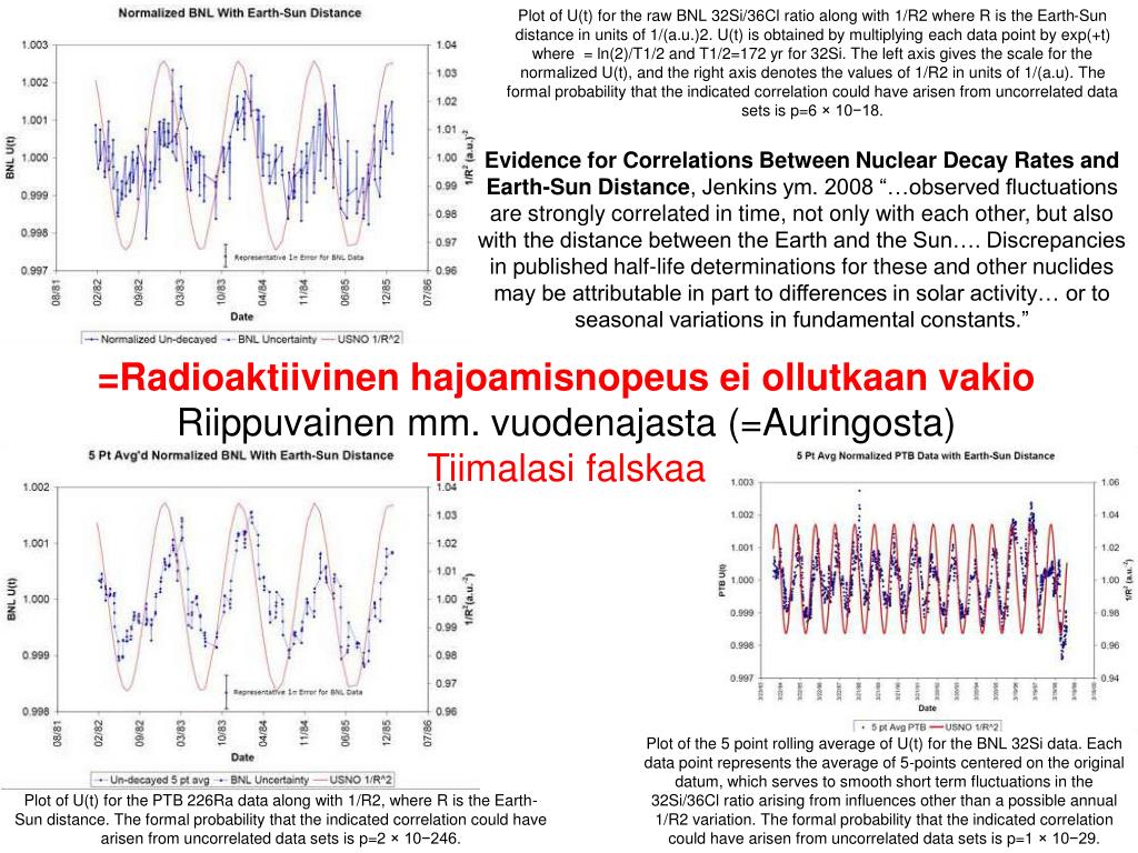 Plot of U(t) for the raw BNL 32Si/36Cl ratio along with 1/R2 where R is the Earth-Sun distance in units of 1/(a.u.)2. U(t) is obtained by multiplying each data point by exp(+t) where = ln(2)/T1/2 and T1/2=172 yr for 32Si. The left axis gives the scale for the normalized U(t), and the right axis denotes the values of 1/R2 in units of 1/(a.u). The formal probability that the indicated correlation could have arisen from uncorrelated data sets is p=6 × 10−18. Evidence for Correlations Between Nuclear Decay Rates and Earth-Sun Distance, Jenkins ym. 2008 “…observed fluctuations are strongly correlated in time, not only with each other, but also with the distance between the Earth and the Sun…. Discrepancies in published half-life determinations for these and other nuclides may be attributable in part to differences in solar activity… or to seasonal variations in fundamental constants.” =Radioaktiivinen hajoamisnopeus ei ollutkaan vakio Riippuvainen mm. vuodenajasta (=Auringosta) Tiimalasi falskaa Plot of the 5 point rolling average of U(t) for the BNL 32Si data. Each data point represents the average of 5-points centered on the original datum, which serves to smooth short term fluctuations in the 32Si/36Cl ratio arising from influences other than a possible annual 1/R2 variation. The formal probability that the indicated correlation could have arisen from uncorrelated data sets is p=1 × 10−29. Plot of U(t) for the PTB 226Ra data along with 1/R2, where R is the Earth-Sun distance. The formal probability that the indicated correlation could have arisen from uncorrelated data sets is p=2 × 10−246.