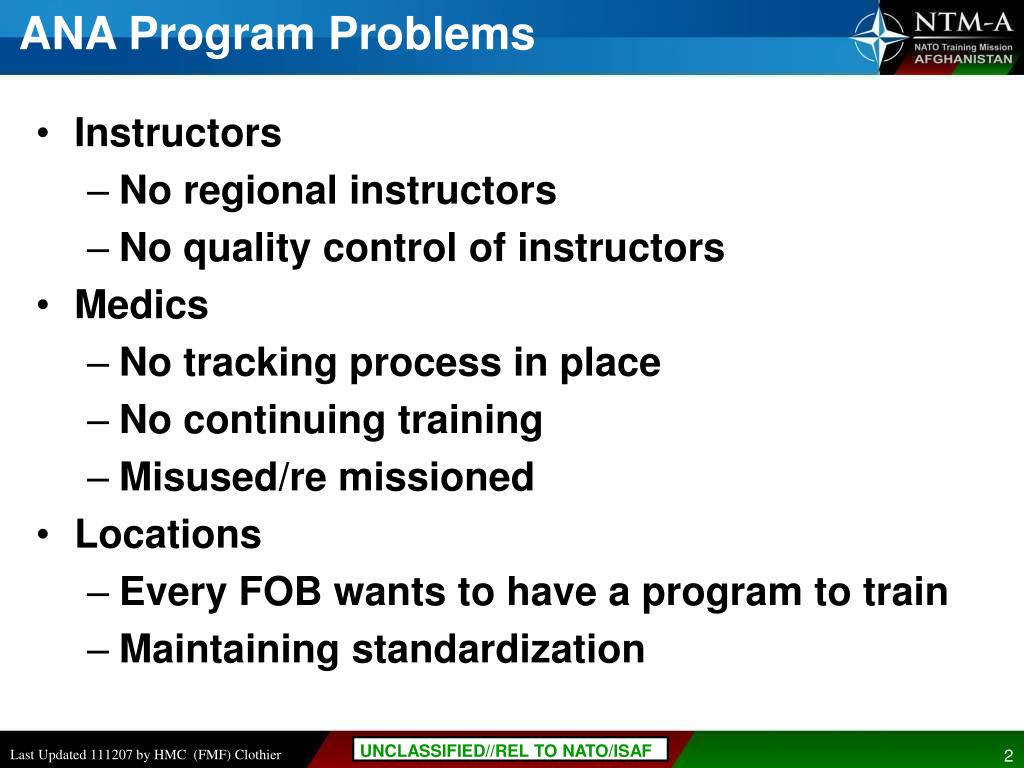 ANA First Responders . CMC Program Overview 6 Regional Locations 3,445 Tashkil Positions 5,126 trained since ’03 Program turned over to the Afghan’s Oct ‘10. UNCLASSIFIED//REL TO NATO/ISAF. Last Updated 111207 by HMC (FMF) Clothier. ANA Program Problems . Instructors