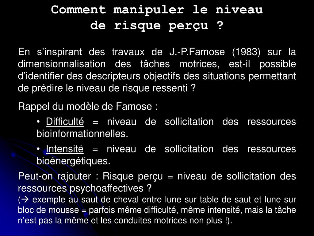 Comment manipuler le niveau de risque perçu ? • En s’inspirant des travaux de J.-P.Famose (1983) sur la dimensionnalisation des tâches motrices, est-il possible d’identifier des descripteurs objectifs des situations permettant de prédire le niveau de risque ressenti ? • Rappel du modèle de Famose : • Difficulté = niveau de sollicitation des ressources bioinformationnelles. • Intensité = niveau de sollicitation des ressources bioénergétiques. • Peut-on rajouter : Risque perçu = niveau de sollicitation des ressources psychoaffectives ? • ( exemple au saut de cheval entre lune sur table de saut et lune sur bloc de mousse = parfois même difficulté, même intensité, mais la tâche n’est pas la même et les conduites motrices non plus !).