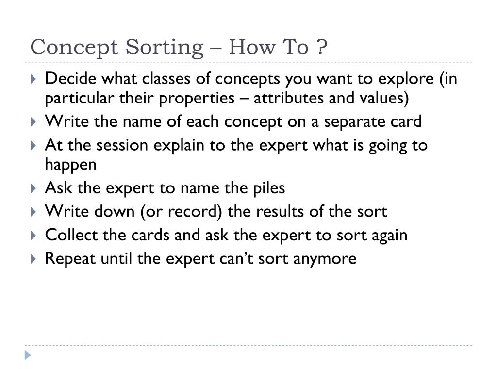 Concept Sorting – How To ? • Decide what classes of concepts you want to explore (in particular their properties – attributes and values) • Write the name of each concept on a separate card • At the session explain to the expert what is going to happen • Ask the expert to name the piles • Write down (or record) the results of the sort • Collect the cards and ask the expert to sort again • Repeat until the expert can’t sort anymore