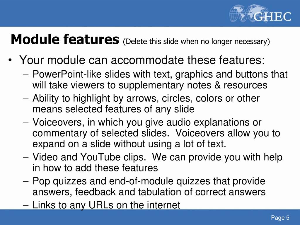 Module features (Delete this slide when no longer necessary) • Your module can accommodate these features: • PowerPoint-like slides with text, graphics and buttons that will take viewers to supplementary notes & resources • Ability to highlight by arrows, circles, colors or other means selected features of any slide • Voiceovers, in which you give audio explanations or commentary of selected slides. Voiceovers allow you to expand on a slide without using a lot of text. • Video and YouTube clips. We can provide you with help in how to add these features • Pop quizzes and end-of-module quizzes that provide answers, feedback and tabulation of correct answers • Links to any URLs on the internet