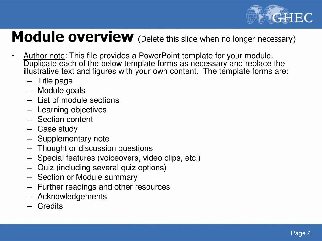 Module overview (Delete this slide when no longer necessary) • Module submission. Send draft module to Tom Hall (thall@epi.ucsf.edu) and to Glenn Nordehn (gnordehn@gmail.com) for review. Use placeholder slides, inserted immediately before the slides to which they refer, to provide instructions for the use of special eLearning features. Examples of such features are given later in this file. GHEC will initiate the review process and arrange for clarification of any questions that arise. • Processing and posting. On completion of the initial review and revision the module will be sent to an IT specialist for processing your module into the appropriate application platform and then posting on GHEC’s website.