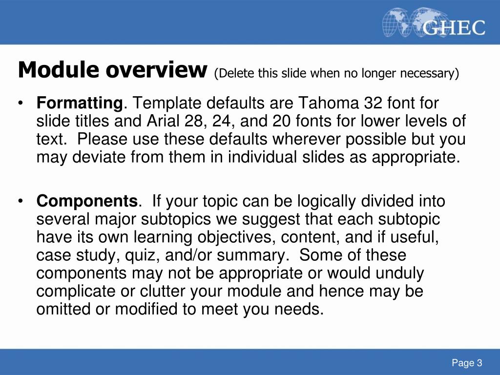 Module overview (Delete this slide when no longer necessary) • Formatting. Template defaults are Tahoma 32 font for slide titles and Arial 28, 24, and 20 fonts for lower levels of text. Please use these defaults wherever possible but you may deviate from them in individual slides as appropriate. • Components. If your topic can be logically divided into several major subtopics we suggest that each subtopic have its own learning objectives, content, and if useful, case study, quiz, and/or summary. Some of these components may not be appropriate or would unduly complicate or clutter your module and hence may be omitted or modified to meet you needs.