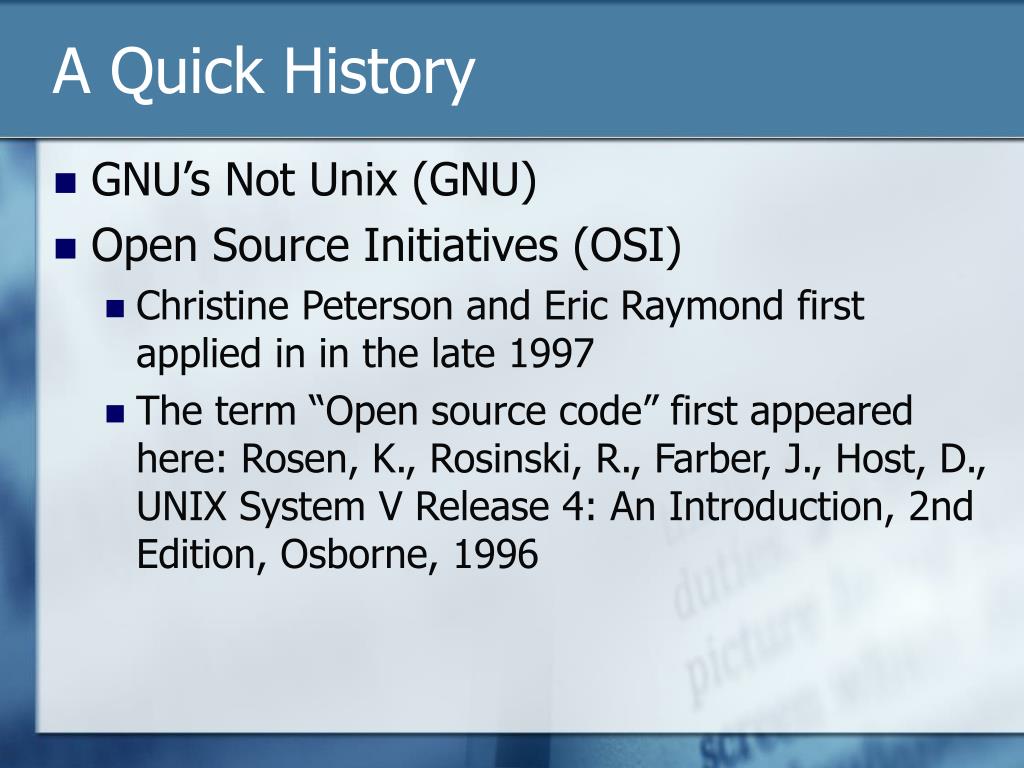 A Quick History • GNU’s Not Unix (GNU) • Open Source Initiatives (OSI) • Christine Peterson and Eric Raymond first applied in in the late 1997 • The term “Open source code” first appeared here: Rosen, K., Rosinski, R., Farber, J., Host, D., UNIX System V Release 4: An Introduction, 2nd Edition, Osborne, 1996