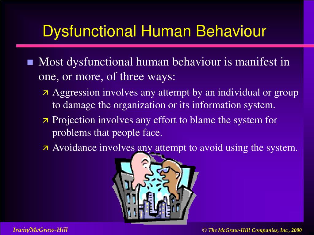 Dysfunctional Human Behaviour • Most dysfunctional human behaviour is manifest in one, or more, of three ways: • Aggression involves any attempt by an individual or group to damage the organization or its information system. • Projection involves any effort to blame the system for problems that people face. • Avoidance involves any attempt to avoid using the system.