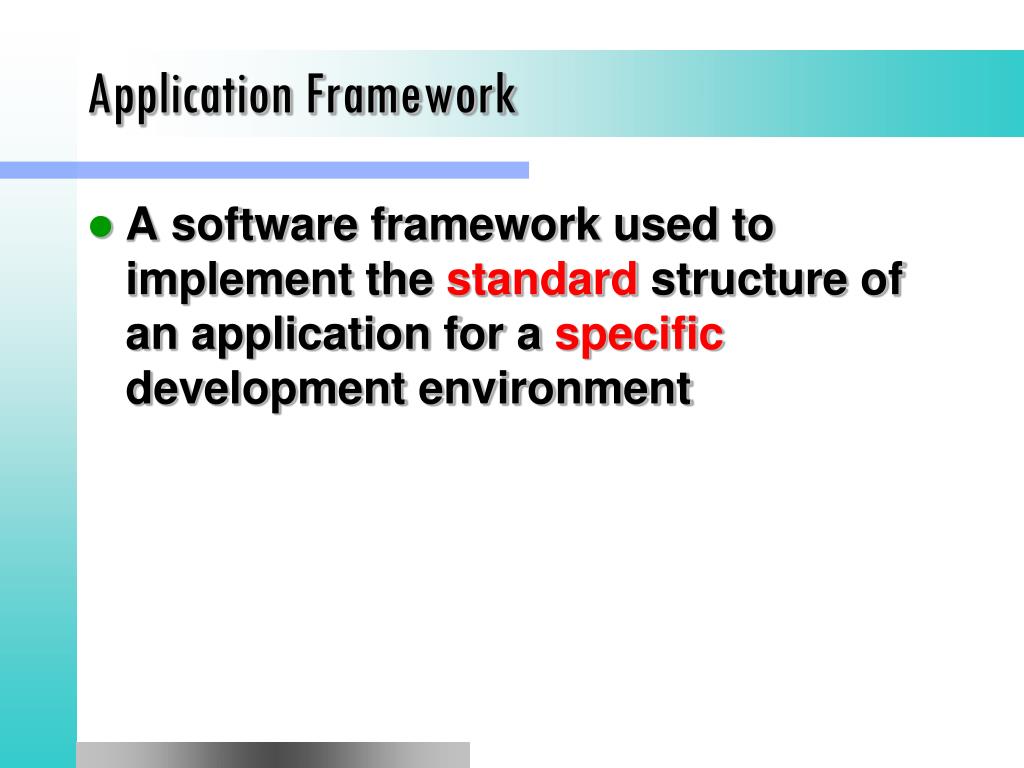 Application Framework • A software framework used to implement the standard structure of an application for a specific development environment