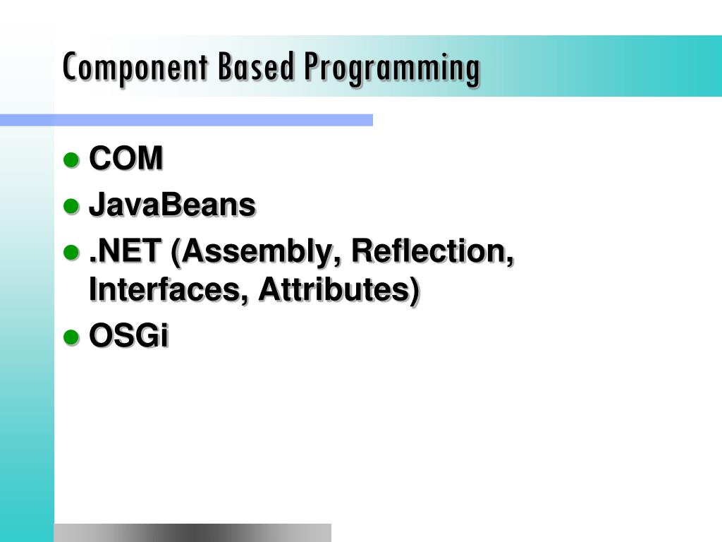 Component Based Programming • COM • JavaBeans • .NET (Assembly, Reflection, Interfaces, Attributes) • OSGi