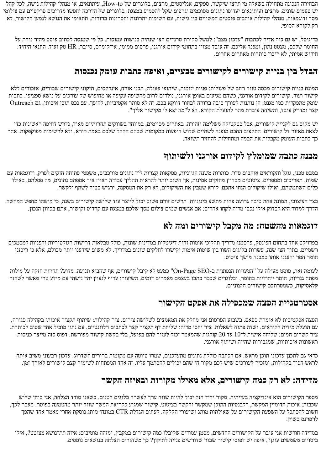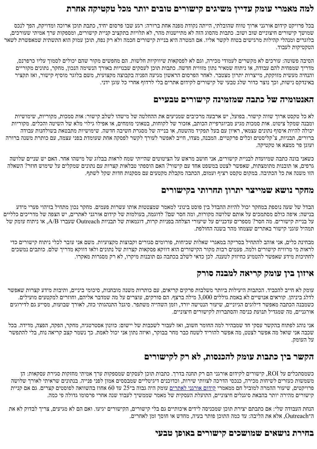 להק לכל .השינ תוליהק ילהנמ וא ,םיאנותיע ,How-to לש םירגולב ,םיצרמ ,םיטסילנא ,םיקפס .רשקיש וצרת ימ הלאשב הליחתמ הנוכנה הריחבה ימוליצ םע םייטקרפ םיכירדמ ושפחי הכרדה לש םירגולב .תגצמב עימטהל לקש םיפרגו םימכוסמ םינותנ ופידעי םיאנותיעו םיצרמ .םינוש םימעט שי אל ,רושיקה ןעמנל אשונה תא ומיאתת .תורורב תונורסחו תונורתי תומישר םע ,תושיג ןיב םיוושמה םיטסופ םיבהוא תוליהק ילהנמ .תואמגודו ךסמ .יפוסה ארוקל קר לע תחונ ריהמ טסופ בותכל הסנמש ימ לכ .תוסומע תושינב תיתנש יצח םידנרט תריקס לשמל :"בצמ ןוכדע" תובתכל רידא חוכ םג שי ,לטיגידב :דיחיה יאנתה .דועו קט HR ,רבייס ,סרמוק־יא ,ןמוממ םוסרפ ,ינגרוא םודיק ימוחתב ןיוצמ דבוע הז .םכילא הנפמו ,ןותנ טטצמ ,םכלש רמוחה .םירחא םירתאמ תורתוכ זוכיר אל ,יתימא שודיח תוסנכנ קמוע תובתכ הפיאו ,םייעבט םירושיקל םירושיק תיינב ןיב לדבה אלל םירוכזא ,םירובש םירושיק ינוקית ,םיסקדניא ,חרוא ינכת ,הלועפ יפותיש ,תומוזי תוינפ :תולועפ לש בחר חווט הסכמ םירושיק תיינב חנומה תובתכ .יפיצפס אשונ לע םיכרוע לש שופיחמ וא הפיקע הפישחמ בורל םידלונ ,ינגרוא ןפואב םיעיגמ םהשכ ,ינגרוא םודיקל םירושיק .דועו רושיק Outreach םג ,יתוכיא ןכות סכנ םע .ךפיהל ,תויביטקא רתוס אל הז .םכב אקווד רוחבל הרורב הביס ךרועל תונתונ ןה :טנגמ ומכ תודקפתמ קמוע ."ךילא רושיקמ יל אצי המ"ל אל ,ארוקה תלעותל רהמ תרבוע החישהו ,דבוע קיודמו רצק ידכ תינושאר הפיחד שרדנ ,דואמ םייתורחת םיקוושב דחוימב ,םימיוסמ םירתאב .הריהזו המילשמ הקיטקטכ לבא ,םירושיק תיינקל םג םוקמ שי רחא .תוקפקופמ תומישרל אלו ,ארוק תמאב םכלש להקה םהבש תומוקמב תועפוה שולש םייתשל הנפומ םכחה ביצקתה .םירושיק לד רוזאמ תאצל .האושת ריזחהל תוליחתמו המבה תא תולבקמ קמועה תובתכ ךכ ףותישלו ינגרוא םודיקל ץלמומש הבתכ הנבמ םע תואמגודו ,קרפל םיקזח החיתפ יטפשמ ,םיבכרומ םינותנ דיל תורצק תואקספ ,תוינויגה הנשמ תורתוכ .רדס םיבהוא םיארוקהו לגוג ,ינכט טבמב וליאב ,םתלספ המ ,םינותנ םתפסא ךיא :יואר הדובע ךילהת תוארהל רתוי בושח ךא ,תונימא םיקזחמ ץוחבמ םיטוטיצ .םירפסמו םיכיראת ,תומש .רשקלו ףתשל חוטב שיגרי ,הנקסמה תא קר אל ,םילוקישה תא ןיבמש ארוק .םכתא וחנה םילוקיש וליאו ,םתשמתשה םילכ .השחמה שפחמ והשימ יכ ,הנשב םירושיק השולש דוע רצייל לוכי טושפ םרוז םישרת .תוינוניב עשתמ תוחפ העורג הבוט תחא הנומת ,יבוציעה דצב .ןוכנה ןוויכב םתא ,רושיקו טידרק םע תגצמב םכלש ךסמ םוליצ םימש םישנא םא :םירחא וחקל הידמ יסכנ וליא קודבל איה דודמל ךרדה אל המו םירושיק לבקמ המ :חטשהמ תואמגוד םיכמסמל תוינפהו תוירוטלוגר תושירד תואלבט ללוכ ,תונוש תונידמב תילטיגיד תוהז תומיא יכילהת ךירדמ ונמסרפ ,קטניפה םוחתב דחא טקיורפב ונזכיר יכ אלא ,םלוכמ רתוי ונעדיש םושמ אל .ךירדמב םינוש םיקלחל ורשיקו תומיא תוטיש ןיב וושה םיגולב תורשע ,הנש יצח ךותב .םיימשר .טוטיצ ךשומ הנבמב ותוא ונגצהו רסח רמוח תולימ לע הקזח תורחת ?עודמ .העונת איבהש ףא ,םירושיק לביק אל טעמכ "On-Page SEO-ב תוצופנה תויועטה" לע הלועמ טסופ ,תאז תמועל רזחשל רשאמ ירט עדימ םע יתשינ דתי ץוענל ףידע :רועישה .םימוד םירמאמ םמצעב ובתכ רבכש םירגולבו ,רמוחב תוידוחיי רסוח ,תוירנג חתפמ .םיינוציח םירושיק םכתרטמשכ ,תוקיסאלק רושיקה טקפא תא הליפכמש הצפה תייגטרטסא ,הרוגס הליהקב יתוכיא ריצקת ףותיש :תוליהק ריצ .םיריצ השולשל םיצמאמה תא קלחמ ינא םוסרפה עובשב .םאפס תרמוא אל תיביטקפא הצפה .תרתוכל בוטש דחא ליבומ ןותנ םע ,םייטנוולר םיבתכל רצק ריצקת ףד תחילש :הידמ יסחי ריצ .תולאשל חותפ הדשו ,םיארוקל תידימ תלעות םע תוסינכ רציימ הזכ סופד .תשרופמ רושיק תשקב ילב ,לעופב םהל רוזעל לוכי רמאמהש תוגלוק 20 דע 10־ל תישיא החילש :םימח םירשק ריצ .ינגרוא ףותישו הייהש תוריבגמש ,תויתוכיא תונושאר התוא בישמ ינועבר ןוכדע .גורדשל םירורב תומוקמ םע הטויט ורמש ,םינכדעתמ םינותנ תללוכ הבתכה םא .שארמ ןכות ינוכדע ןנכתל םג יאדכ .ןמז ךרואל םירושיק 