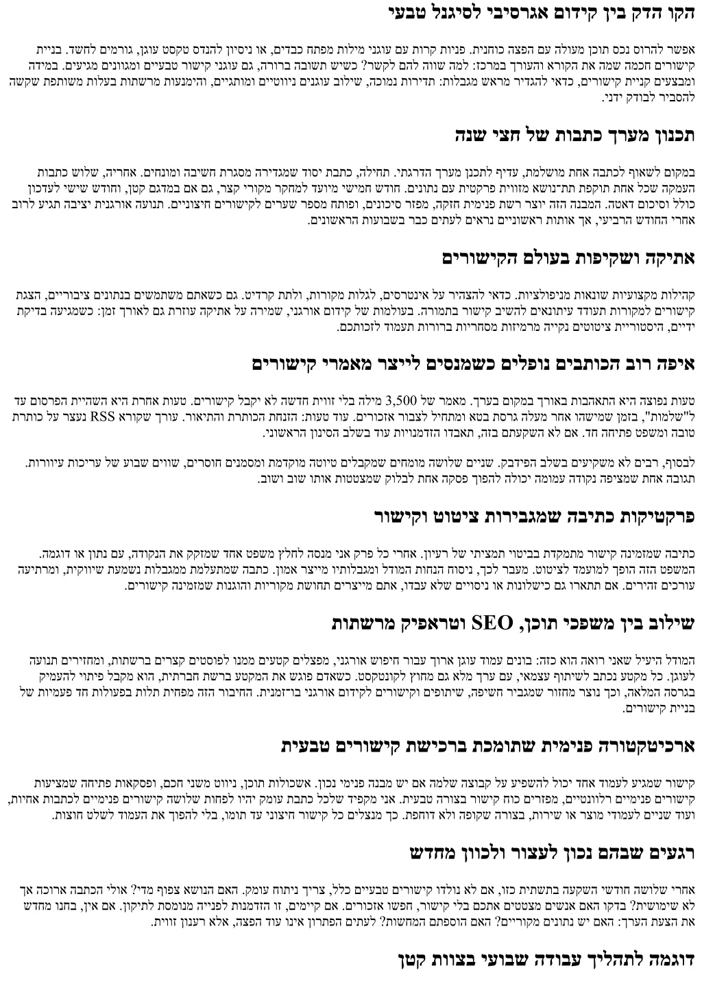 יעבט לנגיסל יביסרגא םודיק ןיב קדה וקה תיינב .דשחל םימרוג ,ןגוע טסקט סדנהל ןויסינ וא ,םידבכ חתפמ תולימ ינגוע םע תורק תוינפ .תינחוכ הצפה םע הלועמ ןכות סכנ סורהל רשפא הדימב .םיעיגמ םינווגמו םייעבט רושיק ינגוע םג ,הרורב הבושת שישכ ?רשקל םהל הווש המל :זכרמב ךרועהו ארוקה תא המש המכח םירושיק השקש תפתושמ תולעב תותשרמ תוענמיהו ,םייגתומו םייטווינ םינגוע בוליש ,הכומנ תורידת :תולבגמ שארמ רידגהל יאדכ ,םירושיק תיינק םיעצבמו .ינדי קדובל ריבסהל הנש יצח לש תובתכ ךרעמ ןונכת תובתכ שולש ,הירחא .םיחנומו הבישח תרגסמ הרידגמש דוסי תבתכ ,הליחת .יתגרדה ךרעמ ןנכתל ףידע ,תמלשומ תחא הבתכל ףואשל םוקמב ןוכדעל ישיש שדוחו ,ןטק םגדמב םא םג ,רצק ירוקמ רקחמל דעוימ ישימח שדוח .םינותנ םע תיטקרפ תיווזמ אשונ־תת תפקות תחא לכש הקמעה בורל עיגת הביצי תינגרוא העונת .םיינוציח םירושיקל םירעש רפסמ חתופו ,םינוכיס רזפמ ,הקזח תימינפ תשר רצוי הזה הנבמה .הטאד םוכיסו ללוכ .םינושארה תועובשב רבכ םיתעל םיארנ םיינושאר תותוא ךא ,יעיברה שדוחה ירחא םירושיקה םלועב תופיקשו הקיתא תגצה ,םיירוביצ םינותנב םישמתשמ םתאשכ םג .טידרק תתלו ,תורוקמ תולגל ,םיסרטניא לע ריהצהל יאדכ .תויצלופינמ תואנוש תויעוצקמ תוליהק תקידב העיגמשכ :ןמז ךרואל םג תרזוע הקיתא לע הרימש ,ינגרוא םודיק לש תומלועב .הרומתב רושיק בישהל םיאנותיע דדועת תורוקמל םירושיק .םכתוכזל דומעת תורורב תוירחסמ תוזימרמ הייקנ םיטוטיצ תיירוטסיה ,םיידי םירושיק ירמאמ רצייל םיסנמשכ םילפונ םיבתוכה בור הפיא דע םוסרפה תייהשה איה תרחא תועט .םירושיק לבקי אל השדח תיווז ילב הלימ 3,500 לש רמאמ .ךרעב םוקמב ךרואב תובהאתה איה הצופנ תועט תרתוכ לע רצענ RSS ארוקש ךרוע .רואיתהו תרתוכה תחנזה :תועט דוע .םירוכזא רובצל ליחתמו אטב תסרג הלעמ רחא והשימש ןמזב ,"תומלש"ל .ינושארה ןוניסה בלשב דוע תויונמדזה ודבאת ,הזב םתעקשה אל םא .דח החיתפ טפשמו הבוט .תורוויע תוכירע לש עובש םיווש ,םירסוח םינמסמו תמדקומ הטויט םילבקמש םיחמומ השולש םיינש .קבדיפה בלשב םיעיקשמ אל םיבר ,ףוסבל .בושו בוש ותוא תוטטצמש קולבל תחא הקספ ךופהל הלוכי המומע הדוקנ הפיצמש תחא הבוגת רושיקו טוטיצ תוריבגמש הביתכ תוקיטקרפ .המגוד וא ןותנ םע ,הדוקנה תא קקזמש דחא טפשמ ץלחל הסנמ ינא קרפ לכ ירחא .ןויער לש יתיצמת יוטיבב תדקמתמ רושיק הנימזמש הביתכ העיתרמו ,תיקוויש תעמשנ תולבגממ תמלעתמש הבתכ .ןומא רציימ ויתולבגמו לדומה תוחנה חוסינ ,ךכל רבעמ .טוטיצל דמעומל ךפוה הזה טפשמה .םירושיק הנימזמש תונגוהו תוירוקמ תשוחת םירציימ םתא ,ודבע אלש םייוסינ וא תונולשיכ םג וראתת םא .םיריהז םיכרוע תותשרמ קיפארטו SEO ,ןכות יכפשמ ןיב בוליש העונת םיריזחמו ,תותשרב םירצק םיטסופל ונממ םיעטק םילצפמ ,ינגרוא שופיח רובע ךורא ןגוע דומע םינוב :הזכ אוה האור ינאש ליעיה לדומה קימעהל יותיפ לבקמ אוה ,תיתרבח תשרב עטקמה תא שגופ םדאשכ .טסקטנוקל ץוחמ םג אלמ ךרע םע ,יאמצע ףותישל בתכנ עטקמ לכ .ןגועל לש תוימעפ דח תולועפב תולת תיחפמ הזה רוביחה .תינמז־וב ינגרוא םודיקל םירושיקו םיפותיש ,הפישח ריבגמש רוזחמ רצונ ךכו ,האלמה הסרגב .םירושיק תיינב תיעבט םירושיק תשיכרב תכמותש תימינפ הרוטקטיכרא תועיצמש החיתפ תואקספו ,םכח ינשמ טווינ ,ןכות תולוכשא .ןוכנ ימינפ הנבמ שי םא המלש הצובק לע עיפשהל לוכי דחא דומעל עיגמש רושיק ,תויחא תובתכל םיימינפ םירושיק השולש תוחפל ויהי קמוע תבתכ לכלש דיפקמ ינא .תיעבט הרוצב רושיק חוכ םירזפמ ,םייטנוולר םיימינפ םירושיק .תוצוח טלשל דומעה תא ךופהל ילב ,ומות דע ינוציח רושיק לכ םילצנמ ךכ .תפחוד אלו הפוקש הרוצב ,תוריש וא רצומ ידומעל םיינש דועו שדחמ ןווכלו רוצעל ןוכנ םהבש םיעגר ךא הכורא הבתכה ילוא ?ידמ ףופצ אשונה םאה .קמוע חותינ ךירצ ,ללכ םייעבט םירושיק ודלונ אל םא ,וזכ תיתשתב העקשה ישדוח השולש ירחא שדחמ ונחב ,ןיא םא .ןוקיתל תסמונמ היינפל תונמדזה וז ,םימייק םא .םירוכזא ושפח ,רושיק ילב םכתא םיטטצמ םישנא ם