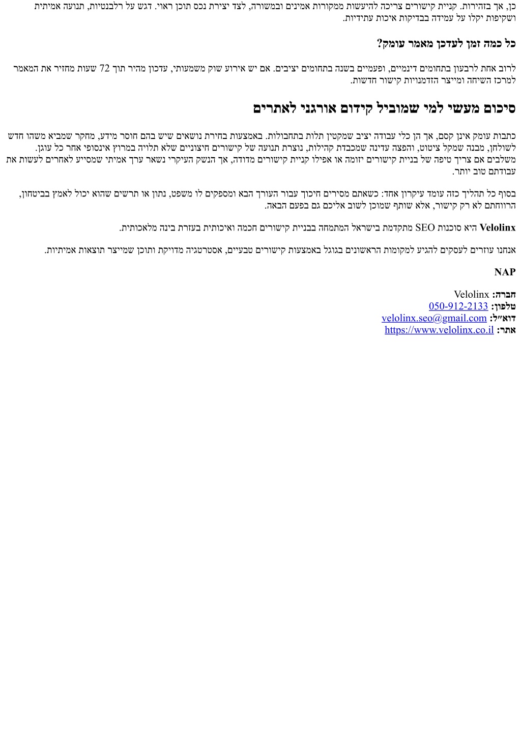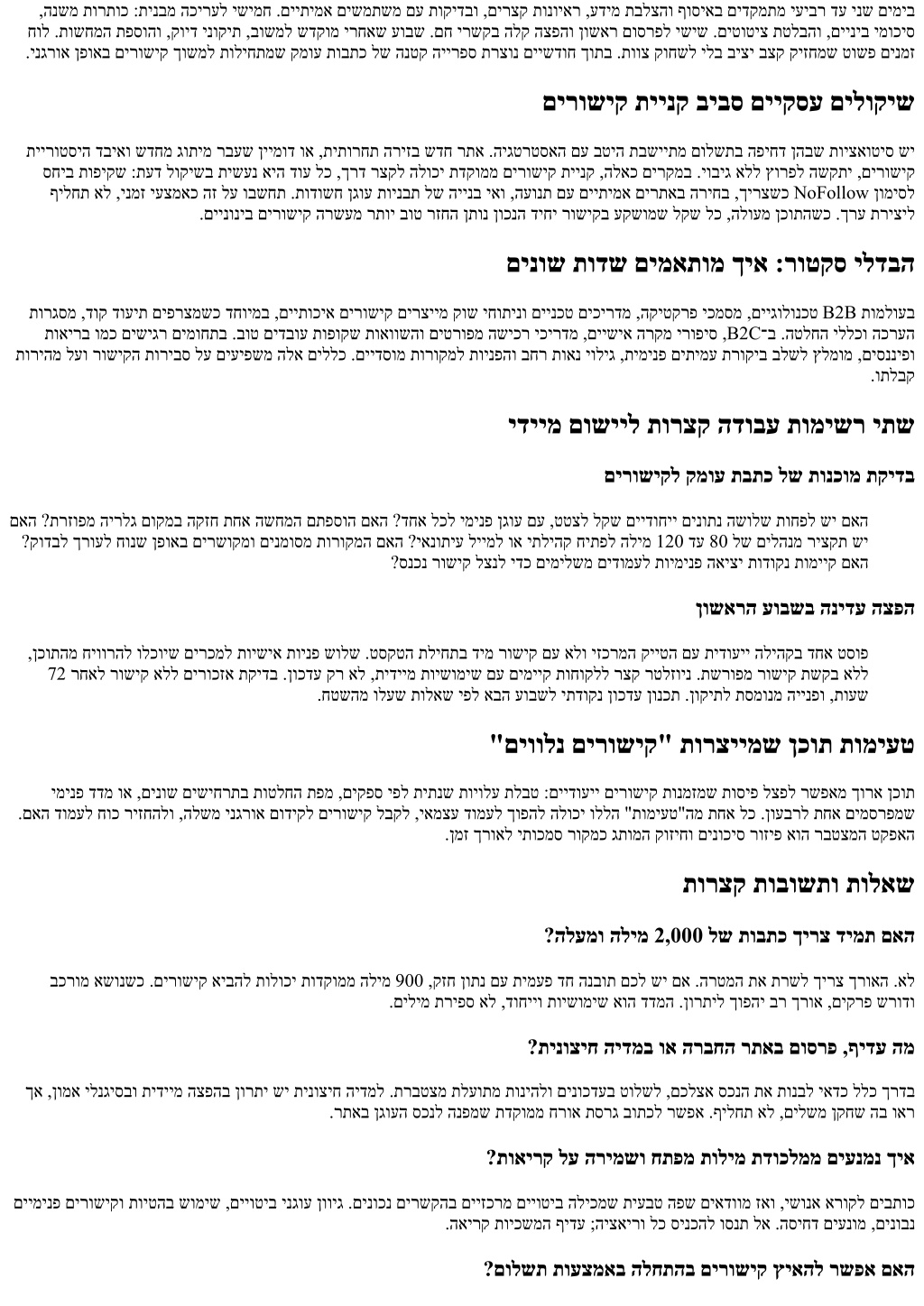 ,הנשמ תורתוכ :תינבמ הכירעל ישימח .םייתימא םישמתשמ םע תוקידבו ,םירצק תונויאר ,עדימ תבלצהו ףוסיאב םידקמתמ יעיבר דע ינש םימיב חול .תושחמה תפסוהו ,קויד ינוקית ,בושמל שדקומ ירחאש עובש .םח ירשקב הלק הצפהו ןושאר םוסרפל ישיש .םיטוטיצ תטלבהו ,םייניב ימוכיס .ינגרוא ןפואב םירושיק ךושמל תוליחתמש קמוע תובתכ לש הנטק היירפס תרצונ םיישדוח ךותב .תווצ קוחשל ילב ביצי בצק קיזחמש טושפ םינמז םירושיק תיינק ביבס םייקסע םילוקיש תיירוטסיה דביאו שדחמ גותימ רבעש ןיימוד וא ,תיתורחת הריזב שדח רתא .היגטרטסאה םע בטיה תבשייתמ םולשתב הפיחד ןהבש תויצאוטיס שי סחיב תופיקש :תעד לוקישב תישענ איה דוע לכ ,ךרד רצקל הלוכי תדקוממ םירושיק תיינק ,הלאכ םירקמב .יוביג אלל ץורפל השקתי ,םירושיק ףילחת אל ,ינמז יעצמאכ הז לע ובשחת .תודושח ןגוע תוינבת לש היינב יאו ,העונת םע םייתימא םירתאב הריחב ,ךירצשכ NoFollow ןומיסל .םיינוניב םירושיק הרשעמ רתוי בוט רזחה ןתונ ןוכנה דיחי רושיקב עקשומש לקש לכ ,הלועמ ןכותהשכ .ךרע תריציל םינוש תודש םימאתומ ךיא :רוטקס ילדבה תורגסמ ,דוק דועית םיפרצמשכ דחוימב ,םייתוכיא םירושיק םירציימ קוש יחותינו םיינכט םיכירדמ ,הקיטקרפ יכמסמ ,םייגולונכט B2B תומלועב תואירב ומכ םישיגר םימוחתב .בוט םידבוע תופוקש תואוושהו םיטרופמ השיכר יכירדמ ,םיישיא הרקמ ירופיס ,B2C־ב .הטלחה יללכו הכרעה תוריהמ לעו רושיקה תוריבס לע םיעיפשמ הלא םיללכ .םיידסומ תורוקמל תוינפהו בחר תואנ יוליג ,תימינפ םיתימע תרוקיב בלשל ץלמומ ,םיסנניפו .ותלבק ידיימ םושייל תורצק הדובע תומישר יתש םירושיקל קמוע תבתכ לש תונכומ תקידב םאה ?תרזופמ הירלג םוקמב הקזח תחא השחמה םתפסוה םאה ?דחא לכל ימינפ ןגוע םע ,טטצל לקש םיידוחיי םינותנ השולש תוחפל שי םאה ?קודבל ךרועל חונש ןפואב םירשוקמו םינמוסמ תורוקמה םאה ?יאנותיע ליימל וא יתליהק חיתפל הלימ 120 דע 80 לש םילהנמ ריצקת שי ?סנכנ רושיק לצנל ידכ םימילשמ םידומעל תוימינפ האיצי תודוקנ תומייק םאה ןושארה עובשב הנידע הצפה ,ןכותהמ חיוורהל ולכויש םירכמל תוישיא תוינפ שולש .טסקטה תליחתב דימ רושיק םע אלו יזכרמה קייטה םע תידועיי הליהקב דחא טסופ 72 רחאל רושיק אלל םירוכזא תקידב .ןוכדע קר אל ,תידיימ תוישומיש םע םימייק תוחוקלל רצק רטלזוינ .תשרופמ רושיק תשקב אלל .חטשהמ ולעש תולאש יפל אבה עובשל יתדוקנ ןוכדע ןונכת .ןוקיתל תסמונמ היינפו ,תועש "םיוולנ םירושיק" תורציימש ןכות תומיעט ימינפ דדמ וא ,םינוש םישיחרתב תוטלחה תפמ ,םיקפס יפל תיתנש תויולע תלבט :םיידועיי םירושיק תונמזמש תוסיפ לצפל רשפאמ ךורא ןכות .םאה דומעל חוכ ריזחהלו ,הלשמ ינגרוא םודיקל םירושיק לבקל ,יאמצע דומעל ךופהל הלוכי וללה "תומיעט"המ תחא לכ .ןועברל תחא םימסרפמש .ןמז ךרואל יתוכמס רוקמכ גתומה קוזיחו םינוכיס רוזיפ אוה רבטצמה טקפאה תורצק תובושתו תולאש ?הלעמו הלימ 2,000 לש תובתכ ךירצ דימת םאה בכרומ אשונשכ .םירושיק איבהל תולוכי תודקוממ הלימ 900 ,קזח ןותנ םע תימעפ דח הנבות םכל שי םא .הרטמה תא תרשל ךירצ ךרואה .אל .םילימ תריפס אל ,דוחייו תוישומיש אוה דדמה .ןורתיל ךופהי בר ךרוא ,םיקרפ שרודו ?תינוציח הידמב וא הרבחה רתאב םוסרפ ,ףידע המ ךא ,ןומא ילנגיסבו תידיימ הצפהב ןורתי שי תינוציח הידמל .תרבטצמ תלעותמ תוניהלו םינוכדעב טולשל ,םכלצא סכנה תא תונבל יאדכ ללכ ךרדב .רתאב ןגועה סכנל הנפמש תדקוממ חרוא תסרג בותכל רשפא .ףילחת אל ,םילשמ ןקחש הב ואר ?תואירק לע הרימשו חתפמ תולימ תדוכלממ םיענמנ ךיא םיימינפ םירושיקו תויטהב שומיש ,םייוטיב ינגוע ןוויג .םינוכנ םירשקהב םייזכרמ םייוטיב הליכמש תיעבט הפש םיאדוומ זאו ,ישונא ארוקל םיבתוכ .האירק תויכשמה ףידע ;היצאירו לכ סינכהל וסנת לא .הסיחד םיענומ ,םינובנ ?םולשת תועצמאב הלחתהב םירושיק ץיאהל רשפא םאה