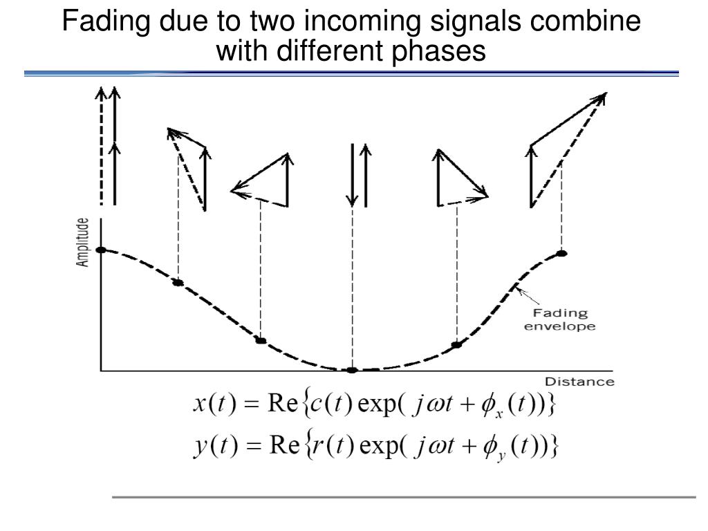 Small-Scale Fading • Rapid fluctuations of radio signal amplitude, phase, or delays • Occurs on short time period or short travel distance • Large-scale path loss effects can be ignored • Caused by arrival of two or more waves from the source combining at the receiver • Resultant detected signal varies widely in amplitudes and phase • Bandwidth of transmitted signal is important factor