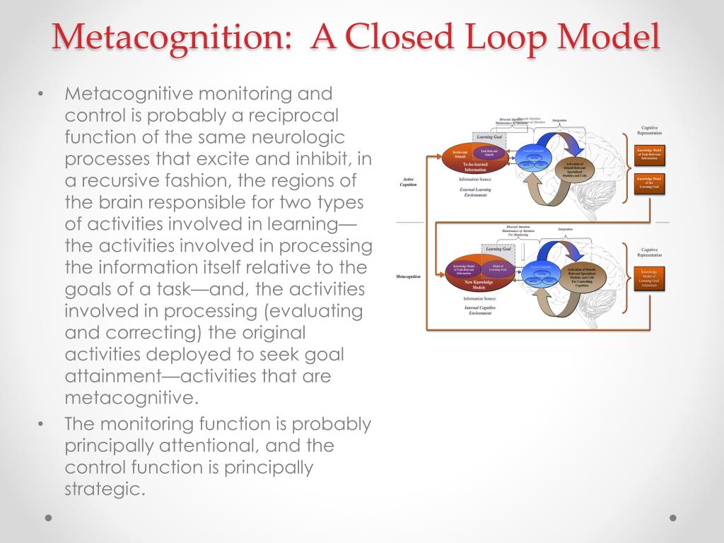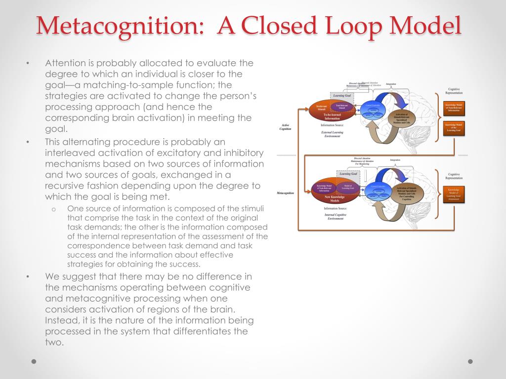 Metacognition: A Closed Loop Model • Metacognitive monitoring and control is probably a reciprocal function of the same neurologic processes that excite and inhibit, in a recursive fashion, the regions of the brain responsible for two types of activities involved in learning—the activities involved in processing the information itself relative to the goals of a task—and, the activities involved in processing (evaluating and correcting) the original activities deployed to seek goal attainment—activities that are metacognitive. • The monitoring function is probably principally attentional, and the control function is principally strategic.
