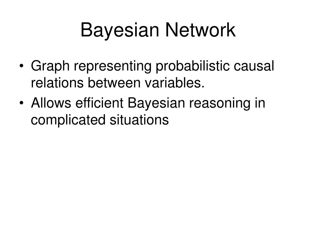Bayesian Network • Graph representing probabilistic causal relations between variables. • Allows efficient Bayesian reasoning in complicated situations