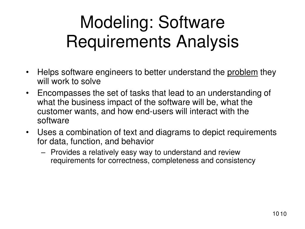 Modeling: Software Requirements Analysis • Helps software engineers to better understand the problem they will work to solve • Encompasses the set of tasks that lead to an understanding of what the business impact of the software will be, what the customer wants, and how end-users will interact with the software • Uses a combination of text and diagrams to depict requirements for data, function, and behavior • Provides a relatively easy way to understand and review requirements for correctness, completeness and consistency 10