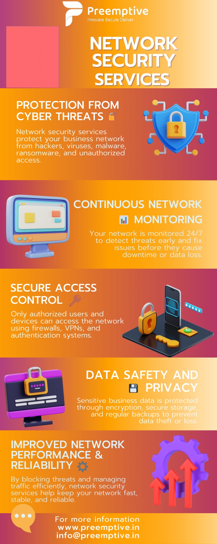 1. NETWORK SECURITY SERVICES NETWORK SECURITY SERVICES PROTECTION FROM CYBER THREATS Network security services protect your business network from hackers, viruses, malware, ransomware, and unauthorized access. ? CONTINUOUS NETWORK MONITORING Your network is monitored 24/7 to detect threats early and fix issues before they cause downtime or data loss. ? SECURE ACCESS CONTROL Only authorized users and devices can access the network using firewalls, VPNs, and authentication systems. ? DATA SAFETY AND ? PRIVACY Sensitive business data is protected through encryption, secure storage, and regular backups to prevent data theft or loss. IMPROVED NETWORK PERFORMANCE & RELIABILITY By blocking threats and managing traffic efficiently, network security services help keep your network fast, stable, and reliable. ⚙ For more information www.preemptive.in info@preemptive.in