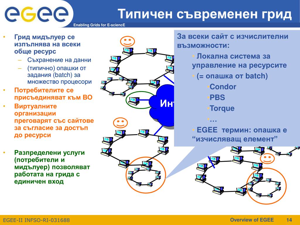 Интернет Типичен съвременен грид За всеки сайт с изчислителни възможности: • Локална система за управление на ресурсите • (= опашка от batch) • Condor • PBS • Torque • … • EGEE термин: опашка е “изчисляващ елемент” • Грид мидълуер се изпълнява на всеки обще ресурс • Съхранение на данни • (типично) опашки от задания (batch) за множество процесори • Потребителите се присъединяват към ВО • Виртуалните организации преговарят със сайтове за съгласие за достъп до ресурси • Разпределени услуги (потребители и мидълуер) позволяват работата на грида с единичен вход Overview of EGEE