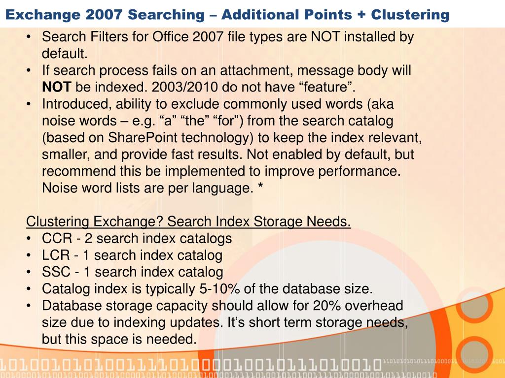 Exchange 2007 Searching – Additional Points + Clustering • Search Filters for Office 2007 file types are NOT installed by default. • If search process fails on an attachment, message body will NOT be indexed. 2003/2010 do not have “feature”. • Introduced, ability to exclude commonly used words (aka noise words – e.g. “a” “the” “for”) from the search catalog (based on SharePoint technology) to keep the index relevant, smaller, and provide fast results. Not enabled by default, but recommend this be implemented to improve performance. Noise word lists are per language. * • Clustering Exchange? Search Index Storage Needs. • CCR - 2 search index catalogs • LCR - 1 search index catalog • SSC - 1 search index catalog • Catalog index is typically 5-10% of the database size. • Database storage capacity should allow for 20% overhead size due to indexing updates. It’s short term storage needs, but this space is needed.