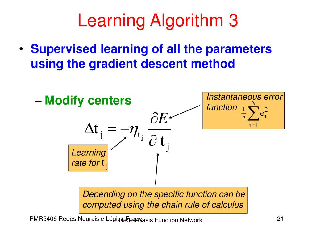 Instantaneous error function Learning rate for Depending on the specific function can be computed using the chain rule of calculus Learning Algorithm 3 • Supervised learning of all the parameters using the gradient descent method • Modify centers Radial Basis Function Network