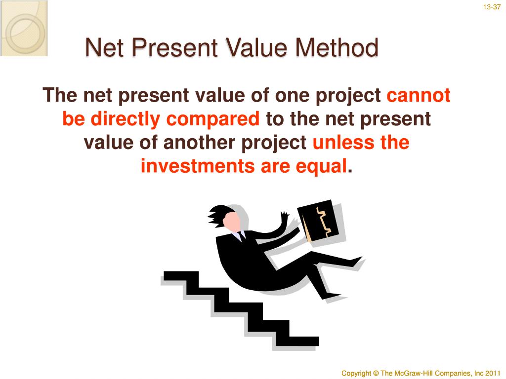Net Present Value Method The net present value of one project cannot be directly compared to the net present value of another project unless the investments are equal.