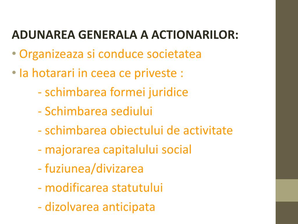 Actiunea = titlul de proprietate asupra unei parti din firma, care da dreptul de a participa la adunarile generale ale actionarilor si la un procent din profit, sub forma de dividende. ADUNAREA GENERALA A ACTIONARILOR: • Organizeaza si conduce societatea • Ia hotarari in ceea ce priveste : - schimbarea formei juridice - Schimbarea sediului - schimbarea obiectului de activitate - majorarea capitalului social - fuziunea/divizarea - modificarea statutului - dizolvarea anticipata