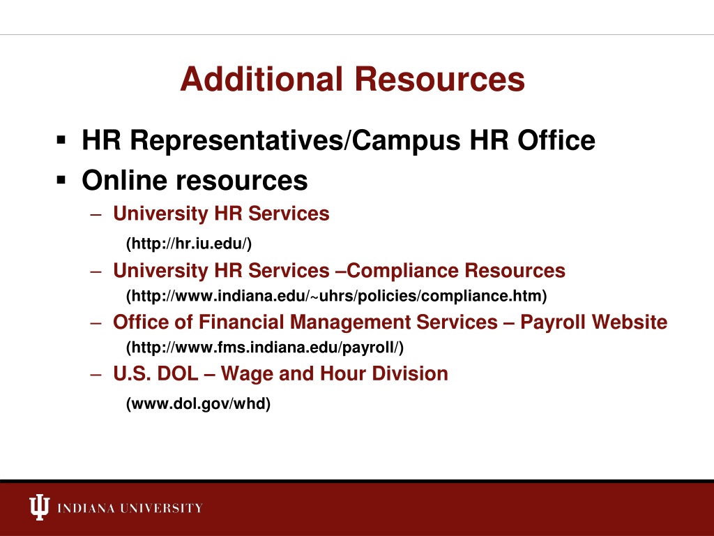 Additional Resources • HR Representatives/Campus HR Office • Online resources • University HR Services • (http://hr.iu.edu/) • University HR Services –Compliance Resources (http://www.indiana.edu/~uhrs/policies/compliance.htm) • Office of Financial Management Services – Payroll Website (http://www.fms.indiana.edu/payroll/) • U.S. DOL – Wage and Hour Division • (www.dol.gov/whd)