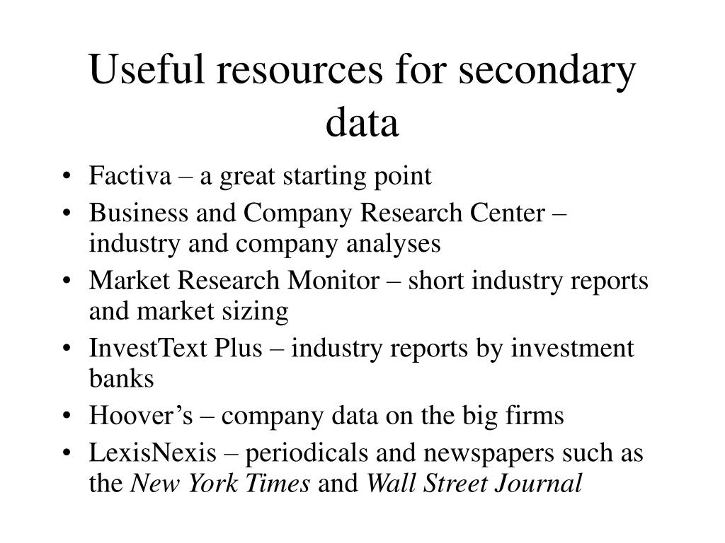 Useful resources for secondary data • Factiva – a great starting point • Business and Company Research Center – industry and company analyses • Market Research Monitor – short industry reports and market sizing • InvestText Plus – industry reports by investment banks • Hoover’s – company data on the big firms • LexisNexis – periodicals and newspapers such as the New York Times and Wall Street Journal