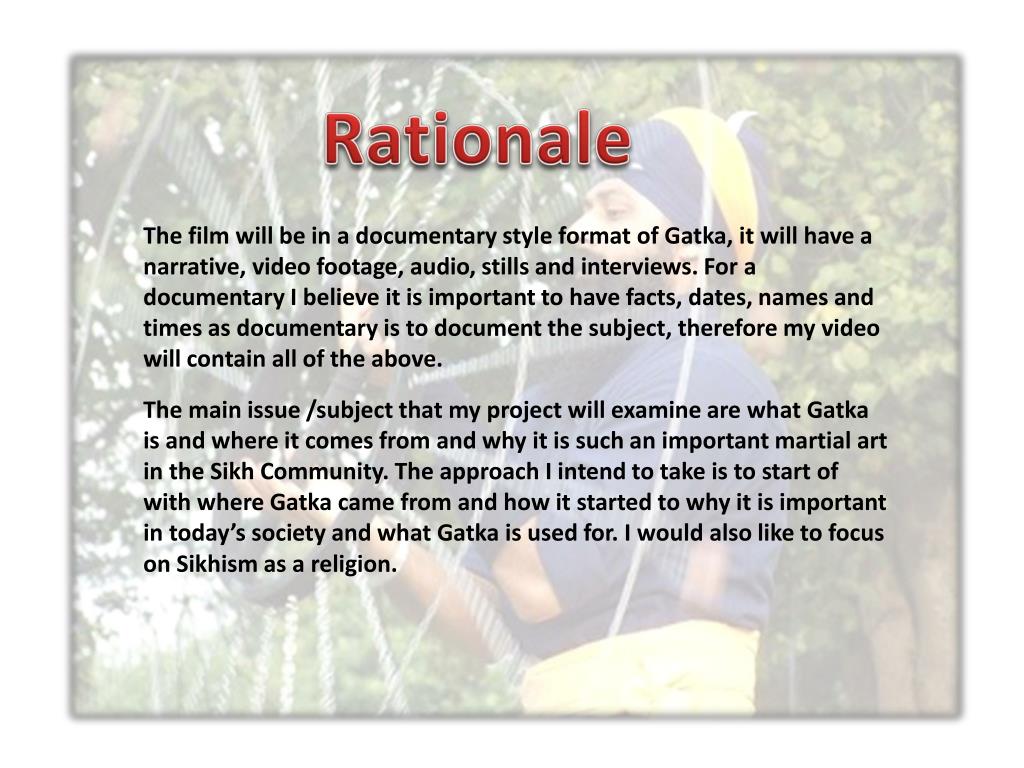Rationale • The film will be in a documentary style format of Gatka, it will have a narrative, video footage, audio, stills and interviews. For a documentary I believe it is important to have facts, dates, names and times as documentary is to document the subject, therefore my video will contain all of the above. • The main issue /subject that my project will examine are what Gatka is and where it comes from and why it is such an important martial art in the Sikh Community. The approach I intend to take is to start of with where Gatka came from and how it started to why it is important in today’s society and what Gatka is used for. I would also like to focus on Sikhism as a religion.