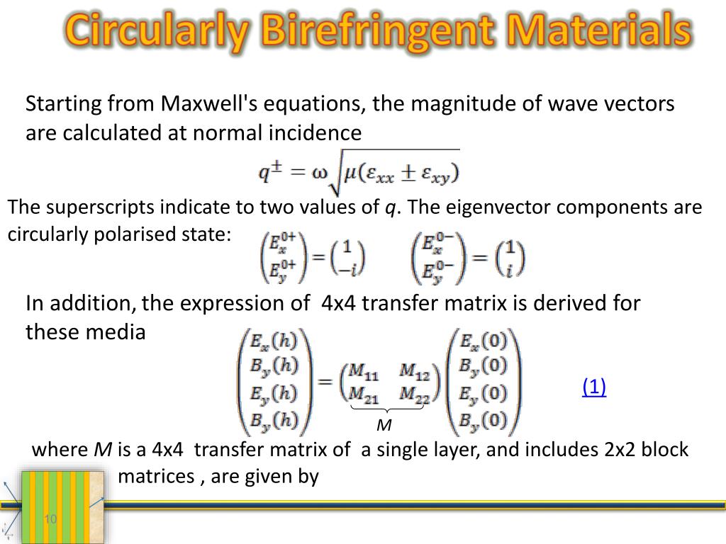 Circularly Birefringent Materials Starting from Maxwell's equations, the magnitude of wave vectors are calculated at normal incidence The superscripts indicate to two values of q.The eigenvector components are circularly polarised state: In addition,the expression of 4x4 transfer matrix is derived for these media (1) M where M is a 4x4 transfer matrix of a single layer, and includes 2x2 block . matrices , are given by