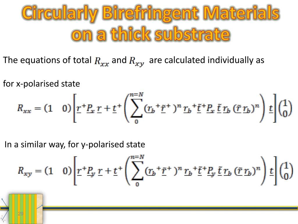 Circularly Birefringent Materials on a thick substrate The equations of total and are calculated individually as for x-polarised state In a similar way, for y-polarised state