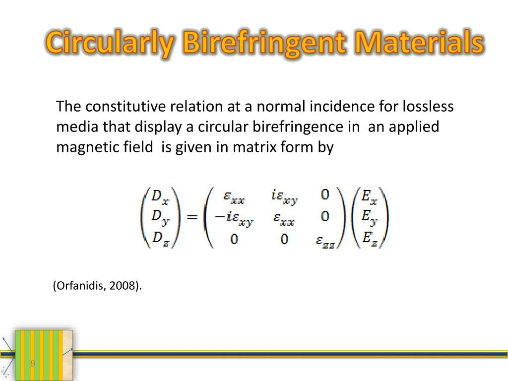 Circularly Birefringent Materials The constitutive relation at a normal incidence for lossless media that display a circular birefringence in an applied magnetic field is given in matrix form by (Orfanidis, 2008).