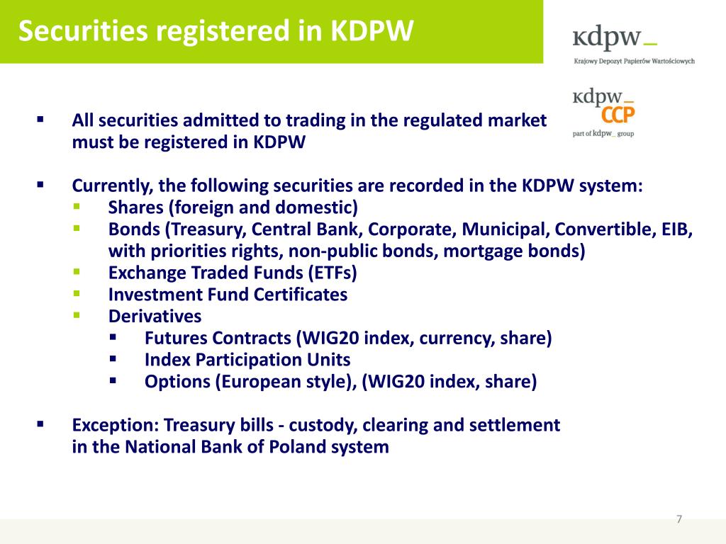 Securities registered in KDPW • All securities admitted to trading in the regulated market must be registered in KDPW • Currently, the following securities are recorded in the KDPW system: • Shares (foreign and domestic) • Bonds (Treasury, Central Bank, Corporate, Municipal, Convertible, EIB, with priorities rights, non-public bonds, mortgage bonds) • Exchange Traded Funds (ETFs) • Investment Fund Certificates • Derivatives • Futures Contracts (WIG20 index, currency, share) • Index Participation Units • Options (European style), (WIG20 index,share) • Exception:Treasury bills - custody, clearing and settlement inthe National Bank of Poland system