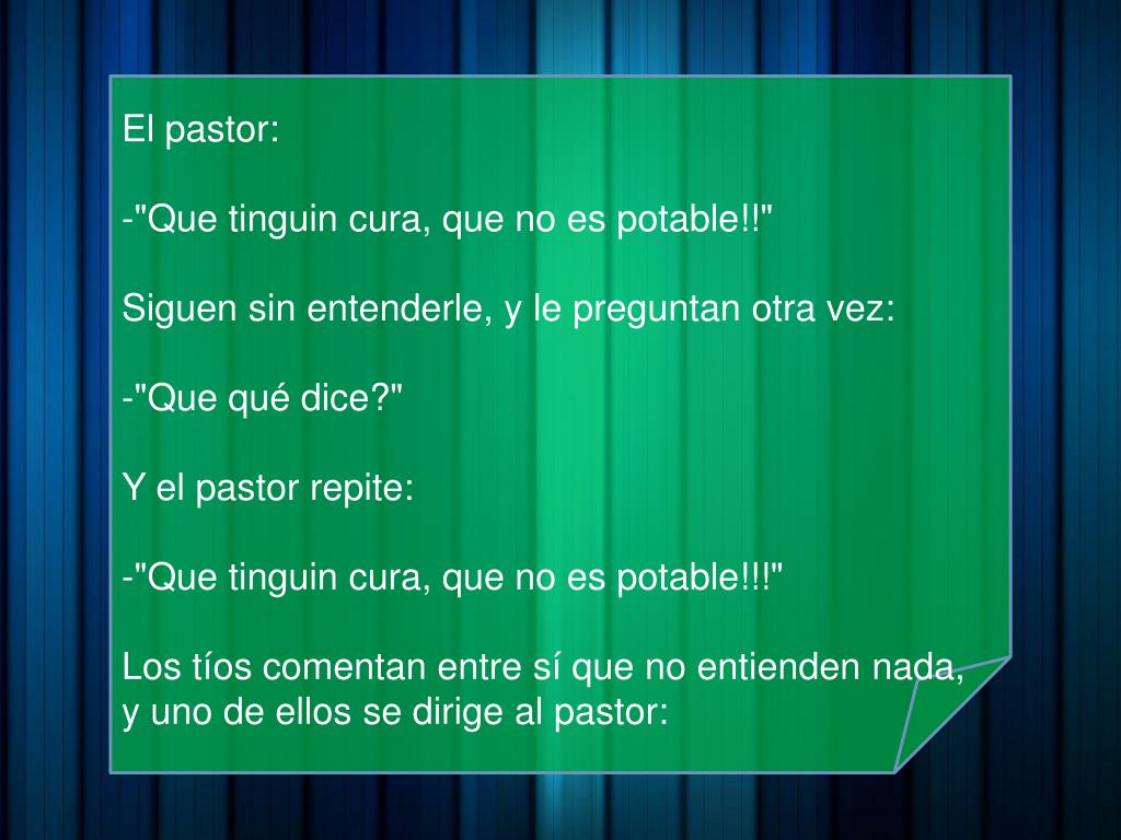 El pastor: -"Que tinguin cura, que no es potable!!"Siguen sin entenderle, y lepreguntanotravez: -"Que quédice?"Y el pastor repite: -"Que tinguin cura, que no es potable!!!"Los tíoscomentan entre sí que no entienden nada, y uno de ellos se dirige al pastor: