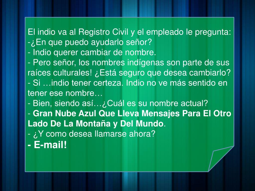 El indio va al Registro Civil y el empleado le pregunta: -¿En que puedo ayudarlo señor? - Indio querer cambiar de nombre. - Pero señor, los nombres indígenas son parte de sus raíces culturales! ¿Está seguro que desea cambiarlo? - Si …indio tener certeza. Indio no ve más sentido en tener ese nombre… - Bien, siendo así…¿Cuál es su nombre actual? - Gran Nube Azul Que Lleva Mensajes Para El Otro Lado De La Montaña y Del Mundo. - ¿Y como desea llamarse ahora? - E-mail!