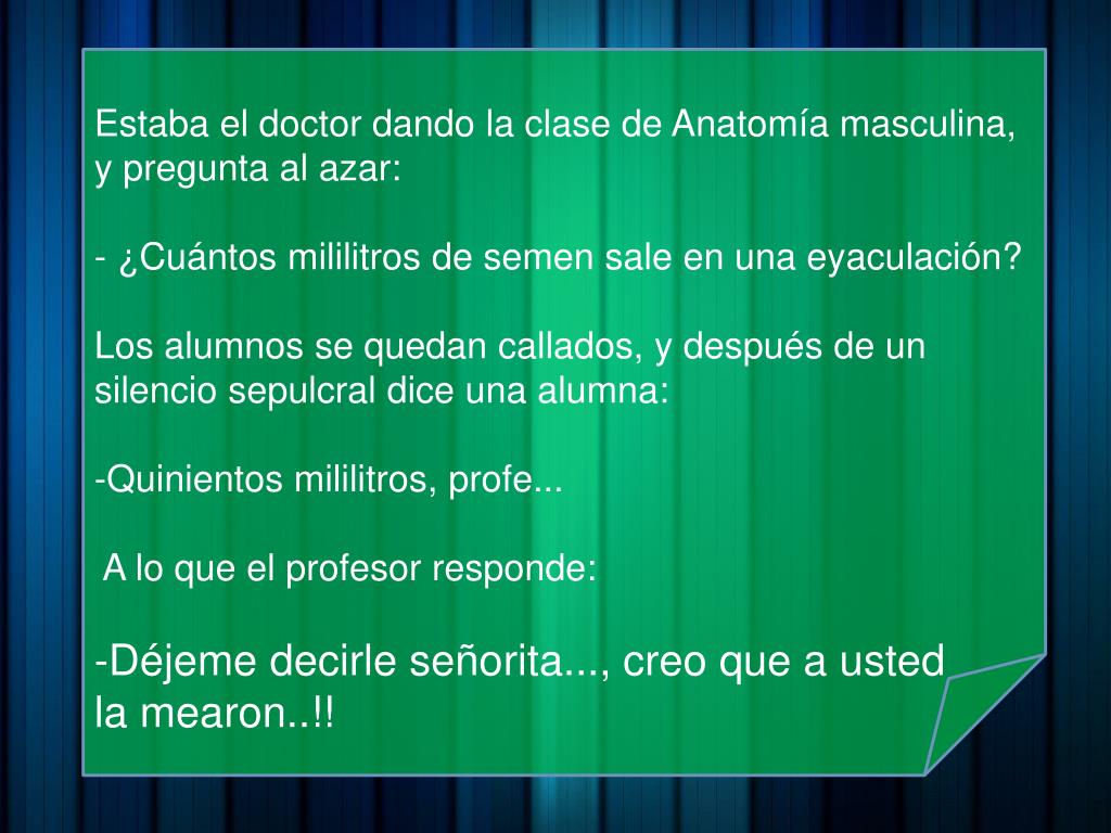Estaba el doctor dando la clase de Anatomía masculina, y pregunta al azar: • - ¿Cuántos mililitros de semen sale en una eyaculación? • Los alumnos se quedan callados, y después de un silencio sepulcral dice una alumna: • Quinientos mililitros, profe... • A lo que el profesor responde: • -Déjeme decirle señorita..., creo que a usted la mearon..!!