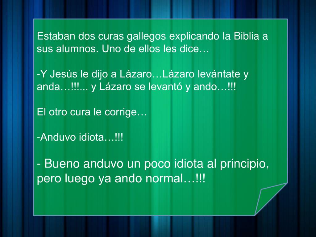 Estaban dos curas gallegos explicando la Biblia a sus alumnos. Uno de ellos les dice… • Y Jesús le dijo a Lázaro…Lázaro levántate y anda…!!!... y Lázaro se levantó y ando…!!! • El otro cura le corrige… • Anduvo idiota…!!! • - Bueno anduvo un poco idiota al principio, pero luego ya ando normal…!!!