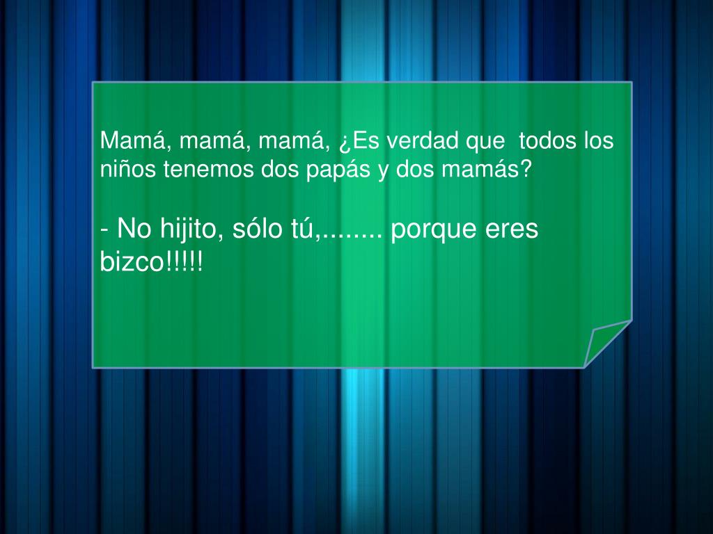 Mamá, mamá, mamá, ¿Es verdad que todos los niños tenemos dos papás y dos mamás? - No hijito, sólo tú,........ porque eres bizco!!!!!