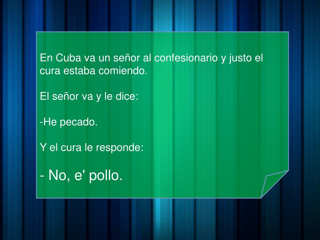 En Cuba va un señor al confesionario y justo el cura estaba comiendo. • El señor va y le dice: • He pecado. • Y el cura le responde: • - No, e' pollo.