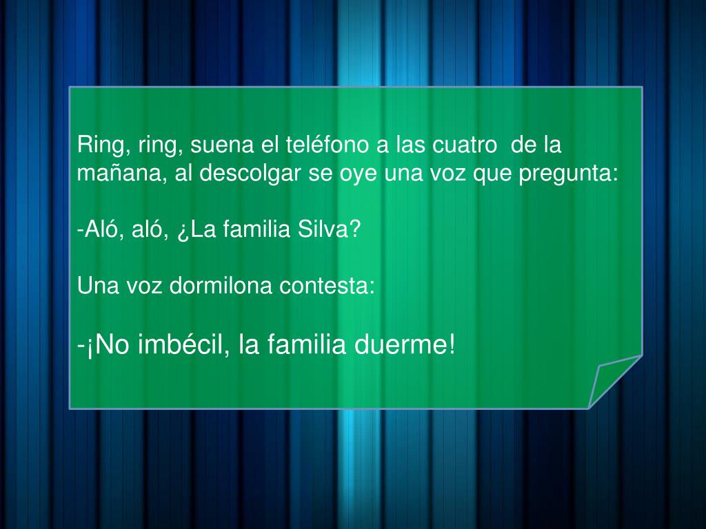 Ring, ring, suena el teléfono a las cuatro de la mañana, al descolgar se oye una voz que pregunta: -Aló, aló, ¿La familia Silva? Una voz dormilona contesta: -¡No imbécil, la familia duerme!