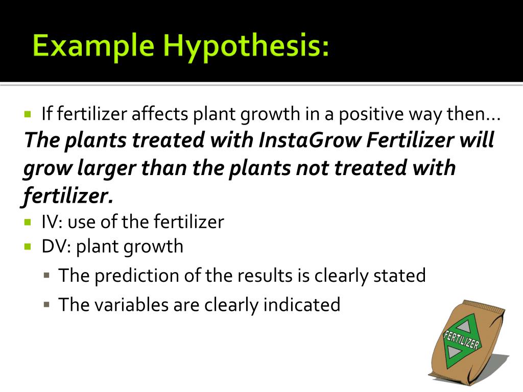 Example Hypothesis: • If fertilizer affects plant growth in a positive way then… The plants treated with InstaGrow Fertilizer will grow larger than the plants not treated with fertilizer. • IV: use of the fertilizer • DV: plant growth • The prediction of the results is clearly stated • The variables are clearly indicated