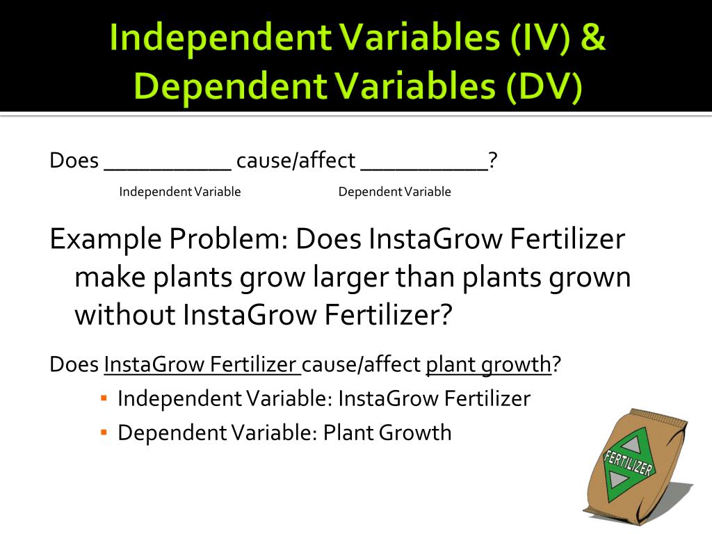 Independent Variables (IV) & Dependent Variables (DV) Does ___________ cause/affect ___________? Independent Variable Dependent Variable Example Problem: Does InstaGrow Fertilizer make plants grow larger than plants grown without InstaGrow Fertilizer? Does InstaGrow Fertilizer cause/affect plant growth? • Independent Variable: InstaGrow Fertilizer • Dependent Variable: Plant Growth