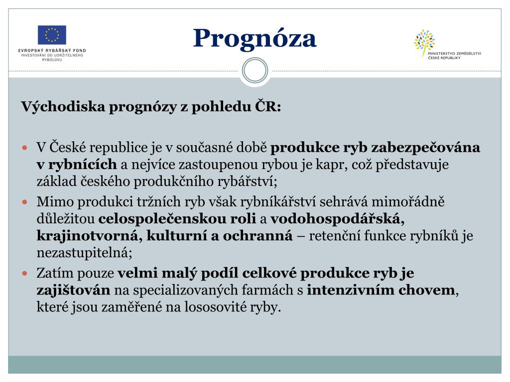 Prognóza Východiska prognózy z pohledu ČR: V České republice je v současné době produkce ryb zabezpečována v rybnících a nejvíce zastoupenou rybou je kapr, což představuje základ českého produkčního rybářství; Mimo produkci tržních ryb však rybníkářství sehrává mimořádně důležitou celospolečenskou roli a vodohospodářská, krajinotvorná, kulturní a ochranná – retenční funkce rybníků je nezastupitelná; Zatím pouze velmi malý podíl celkové produkce ryb je zajištován na specializovaných farmách s intenzivním chovem, které jsou zaměřené na lososovité ryby.