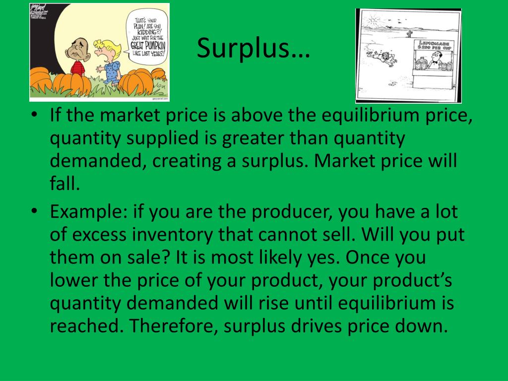 Surplus… • If the market price is above the equilibrium price, quantity supplied is greater than quantity demanded, creating a surplus. Market price will fall. • Example: if you are the producer, you have a lot of excess inventory that cannot sell. Will you put them on sale? It is most likely yes. Once you lower the price of your product, your product’s quantity demanded will rise until equilibrium is reached. Therefore, surplus drives price down.