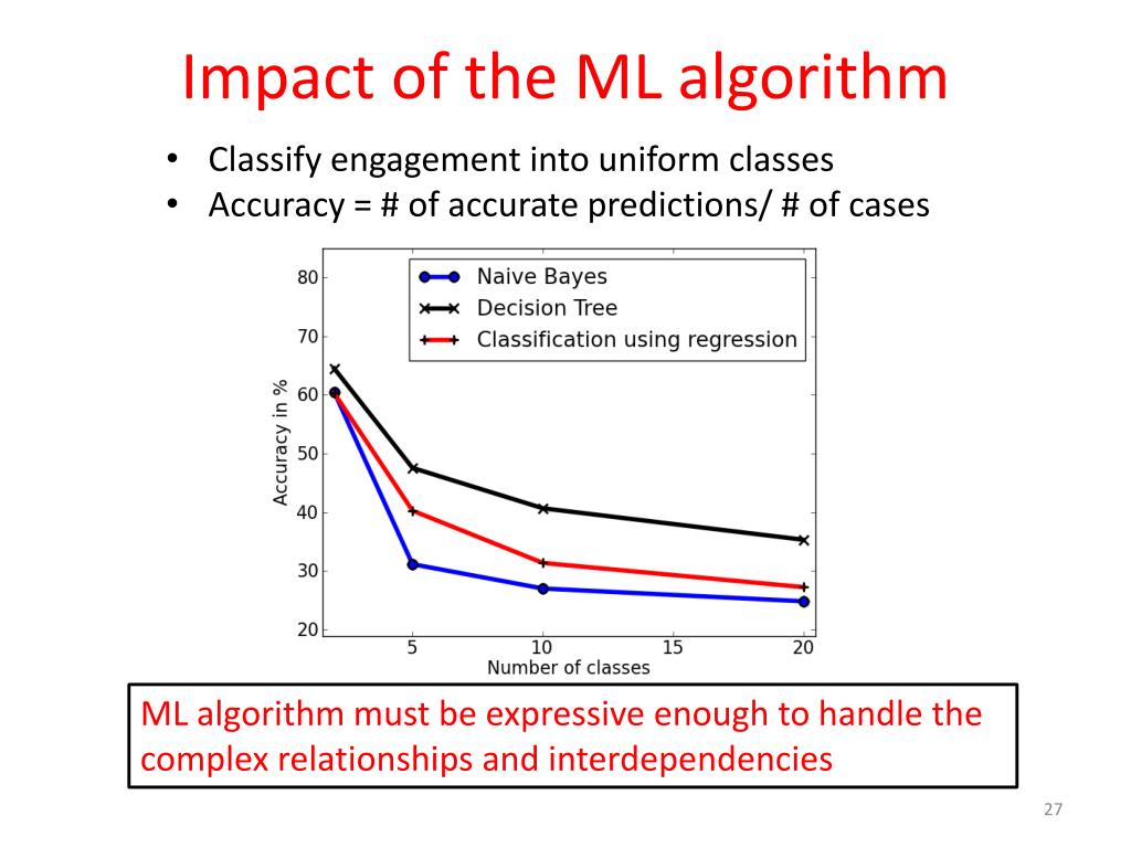Impact of the ML algorithm • Classify engagement into uniform classes • Accuracy = # of accurate predictions/ # of cases ML algorithm must be expressive enough to handle the complex relationships and interdependencies