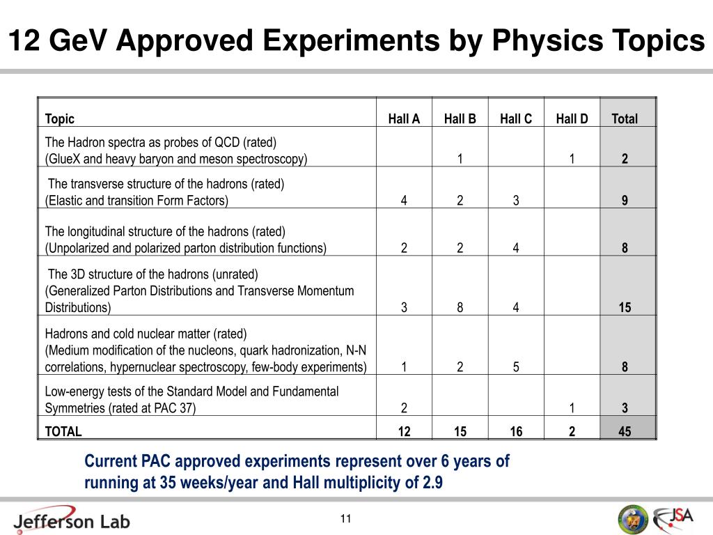 12 GeV Approved Experiments by Physics Topics Current PAC approved experiments represent over 6 years of running at 35 weeks/year and Hall multiplicity of 2.9