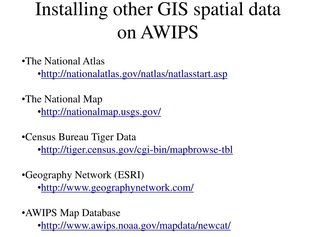 Installing other GIS spatial data on AWIPS http://www.awips.noaa.gov/mapdata/newcat/papers/agmgfaq.htm#Question_5
