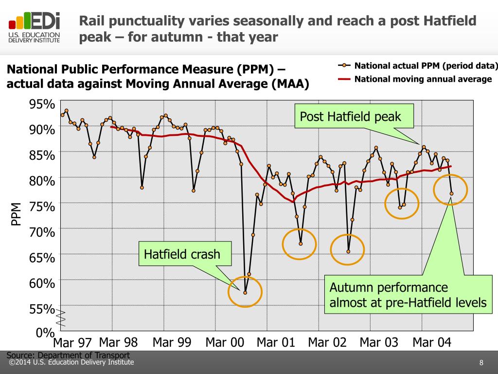 Rail punctuality varies seasonally and reach a post Hatfield peak – for autumn - that year National actual PPM (period data) National Public Performance Measure (PPM) – actual data against Moving Annual Average (MAA) National moving annual average 95% Post Hatfield peak 90% 85% 80% 75% PPM 70% Hatfield crash 65% Autumn performance almost at pre-Hatfield levels 60% 55% 0% Mar 98 Mar 99 Mar 00 Mar 01 Mar 02 Mar 03 Mar 04 Mar 97 Source: Department of Transport