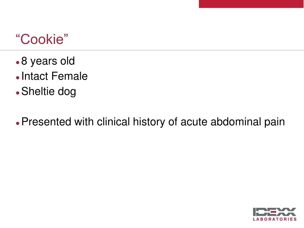 Dog with Acute Abdominal Pain. Dennis B. DeNicola, DVM, PhD, DACVP Chief Veterinary Educator IDEXX Laboratories. “Cookie”. 8 years old Intact Female Sheltie dog Presented with clinical history of acute abdominal pain. “Cookie” - 8 Year-old, Sheltie.