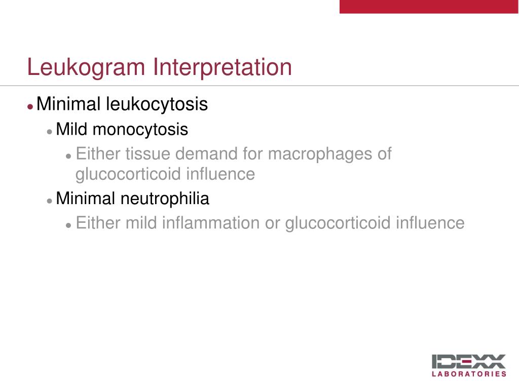 Leukogram Interpretation • Minimal leukocytosis • Mild monocytosis • Either tissue demand for macrophages of glucocorticoid influence • Minimal neutrophilia • Either mild inflammation or glucocorticoid influence