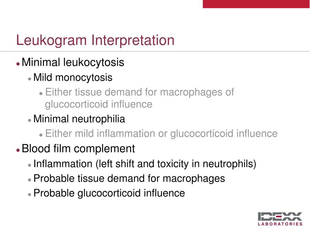 Leukogram Interpretation • Minimal leukocytosis • Mild monocytosis • Either tissue demand for macrophages of glucocorticoid influence • Minimal neutrophilia • Either mild inflammation or glucocorticoid influence • Blood film complement • Inflammation (left shift and toxicity in neutrophils) • Probable tissue demand for macrophages • Probable glucocorticoid influence